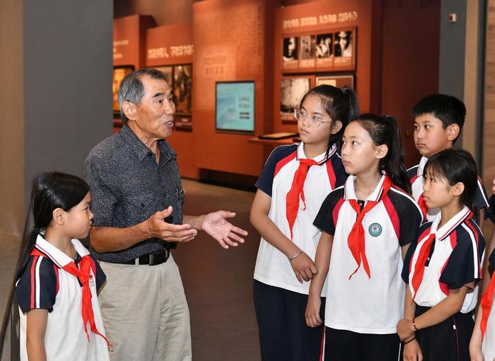 7月8日,杨光明(左二)在马本斋纪念馆向小学生讲述杨杰一的战斗故事。