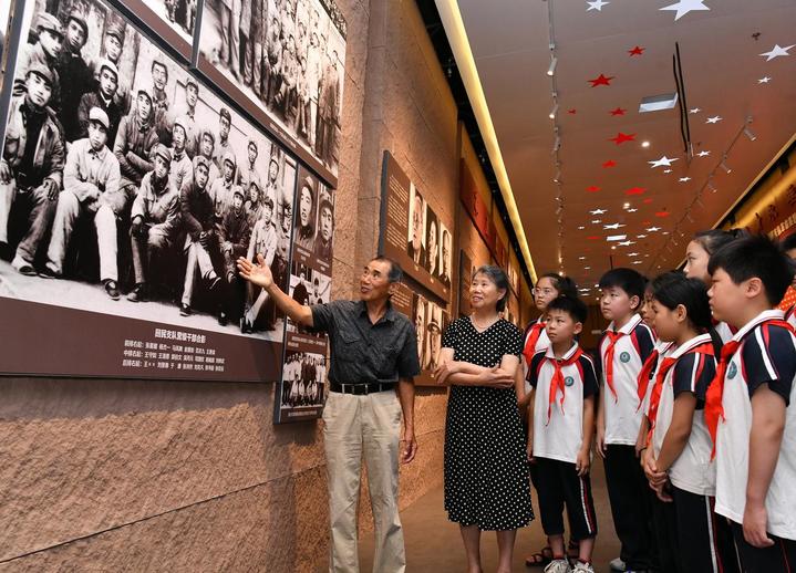 7月8日,杨光明(左一)、杨若梅(左二)在马本斋纪念馆向小学生讲述回民支队的故事。