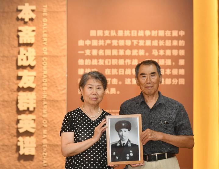 7月8日,杨光明(右)、杨若梅在马本斋纪念馆“本斋战友群英谱”前与父亲杨杰一的照片合影。回民支队的战旗虽已隐入历史烟云,但那在华北平原上空激荡过的呐喊与荣光,却化作民族精神星空中永不熄灭的星辰,照亮了历史的天空,更深深烙印在后人的心间。