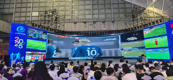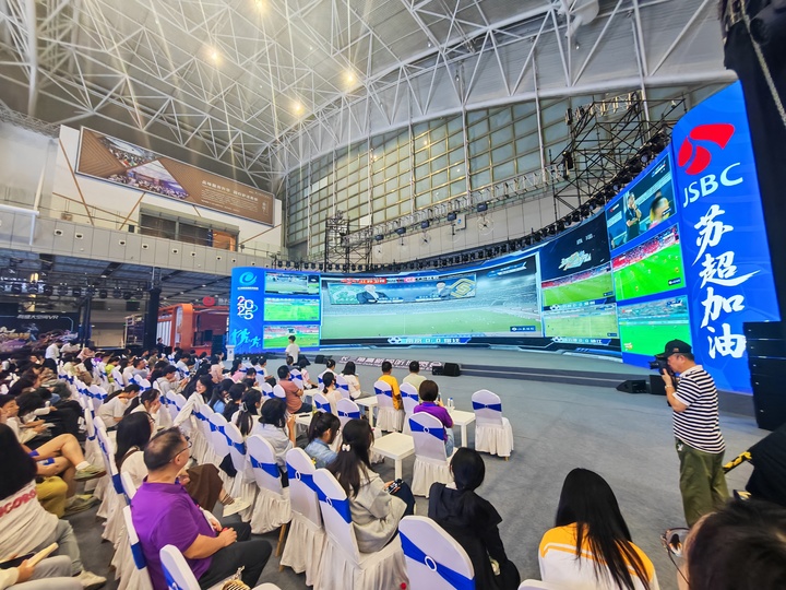 “苏超”相关活动成为展会亮点。组委会举办“苏超”主题微短剧《重生,我在“苏超”踢前锋》发布会,同步推出“激情视听展,热血看苏超”4K高清直播专题活动。9月27日苏超联赛常规赛收官战期间,主舞台实现“六场同开”同步直播,现场设置扫码互动环节,观众可通过预测比分参与抽奖,获得苏超周边产品。未来科技公司通过AI 2D转3D技术实现赛事实时立体化转播,进一步提升观赛体验。