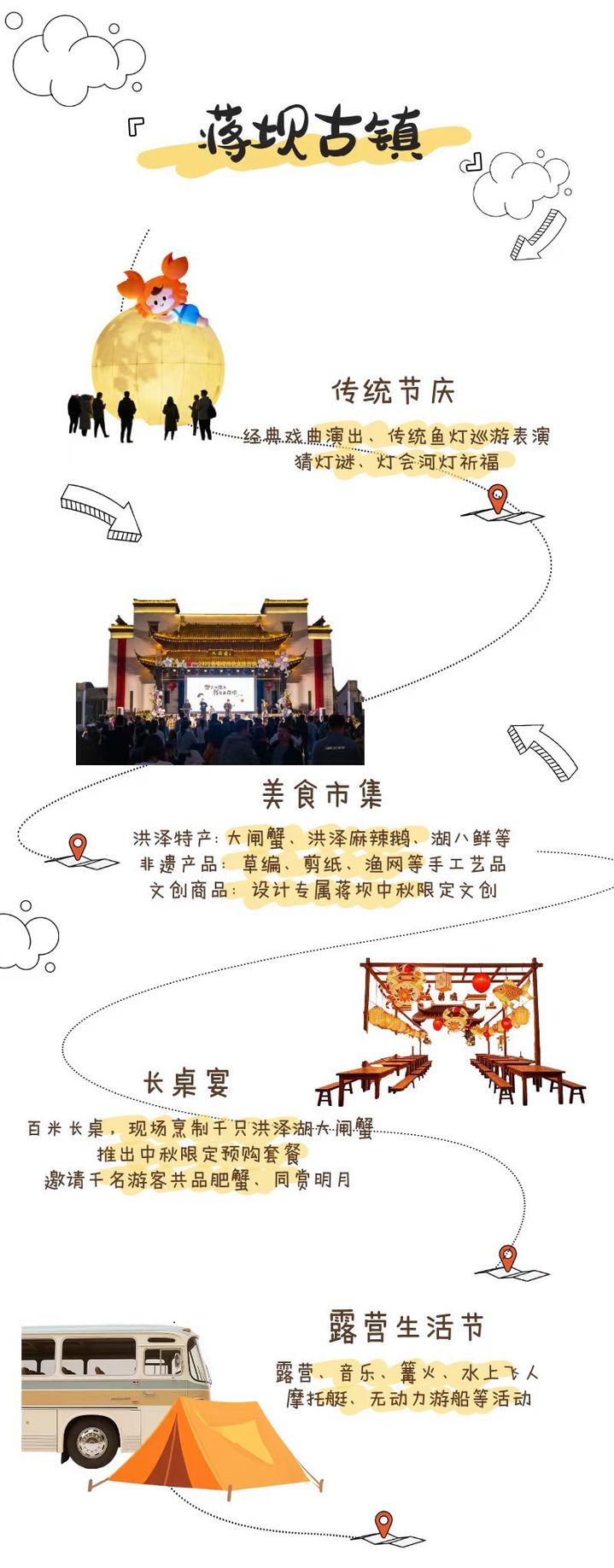 逛完阅湖湾,10 月 5 日 - 10 月 6 日,就去蒋坝古镇赴一场水乡中秋之约吧!这座被岁月温柔以待的千年小镇,青砖黛瓦间藏着最浓的中秋韵味,渔灯巡游点亮夜色,长桌宴盛满团圆,让你在嗑蟹的闲趣里,感受古镇的静谧与热闹。