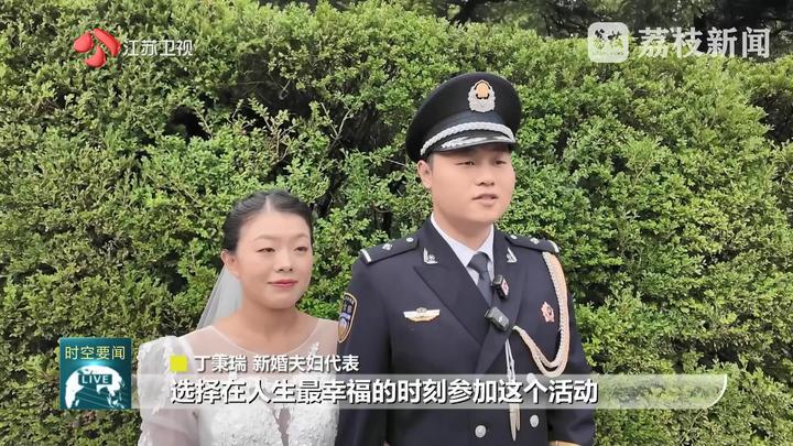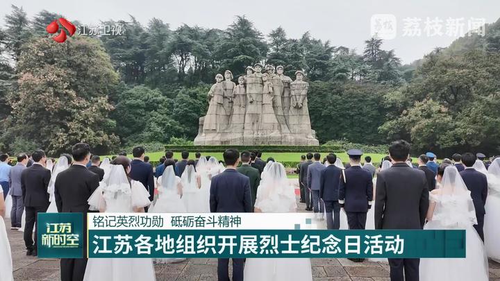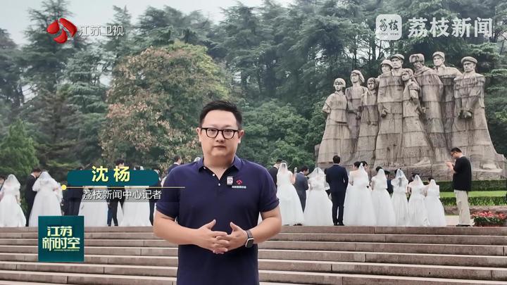 荔枝新闻中心记者沈杨说:“这里是南京雨花台烈士陵园。上午九点,南京市百余名新婚夫妇满怀对革命先烈的深切敬仰,手执鲜花,依次缓步走向雨花台烈士就义群雕,向英烈致以崇高的敬意。”