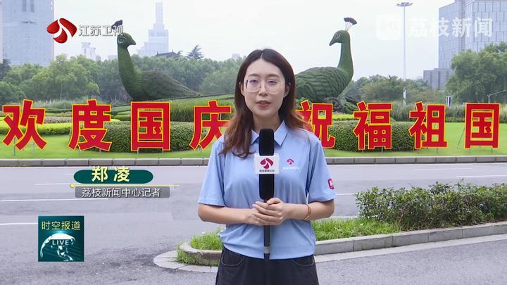 荔枝新闻中心记者郑凌说:“为迎接国庆,南京鼓楼广场的标志性建筑——孔雀绿雕已经完成了出新。在广场的东西两侧,竖立着‘欢度国庆 祝福祖国’几个红色大字,与美丽的鲜花交相呼应,吸引了众多市民和游客驻足打卡。”
