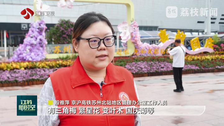 京沪高铁苏州北站地区管理办公室工作人员殷雅萍说:“有三角梅、繁星花、变叶木、国庆菊等,强调的是一种蓬勃向上、百花争艳、生机盎然的景象,也寓意着国家发展的繁荣似锦。”