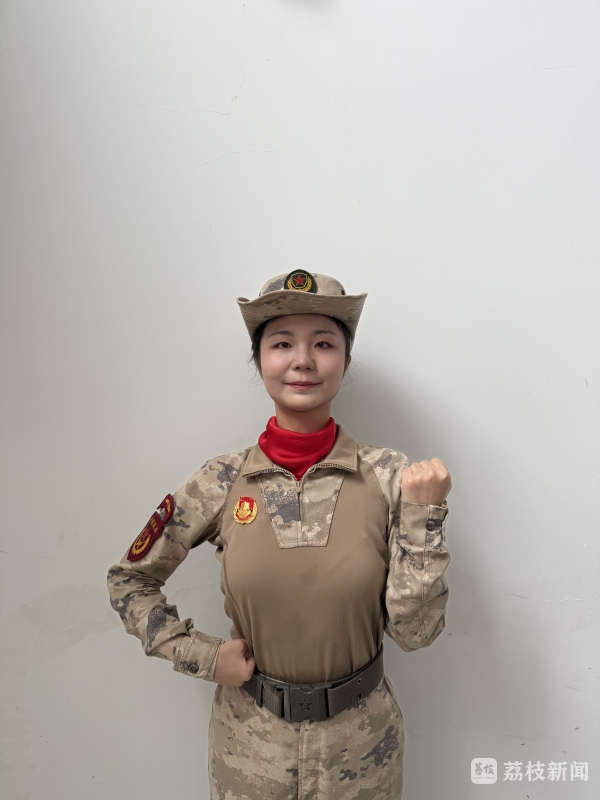 蒿蓝泽2021年考入江苏经贸职业技术学院。2022年,从小在军人家庭成长的她选择应征入伍,在中国人民解放军某部队服役两年。2024年3月退役,回到学校学习。今年2月,她收到阅兵任务赴训,经层层选拔,入选民兵方阵。