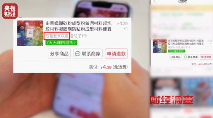 记者网购了几款自制软泥玩具套装,收货后发现标注“成型水”的瓶子内并非液体,而是白色粉末,商家称这些粉末就是硼砂,加温水即可调配成成型水。