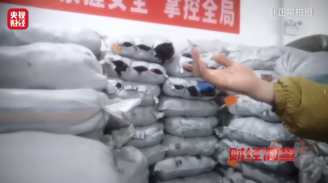 公司车间一侧堆放着各地加工户寄回来的成品手套,客服称回收后会统一运给客户。记者还看到多名客服正在视频推销。