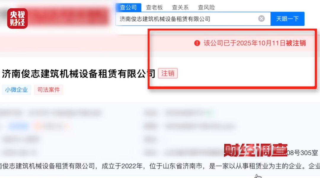 离开欧梵公司后,记者查询其手套订购企业,发现一家订购十万双、约定2026年3月前交付的济南俊志建筑机械设备租赁有限公司早已注销。