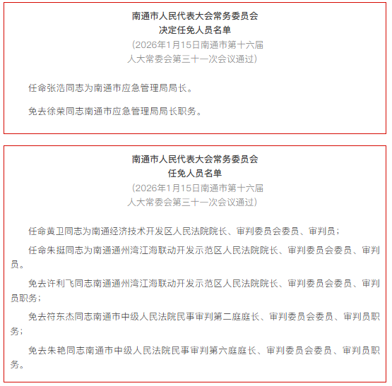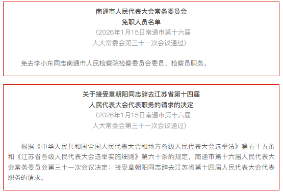 1月15日,南通市第十六届人大常委会第三十一次会议召开,审议通过一批人事任免议案。