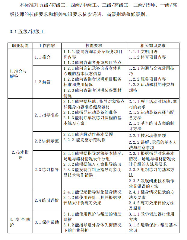 △《社会体育指导员国家职业技能标准(修订版)》中社会体育指导员(五级/初级工)工作要求