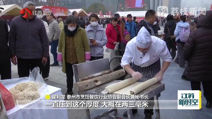 泰州市烹饪餐饮行业协会副会长兼秘书长翟利龙说:“用棍子这种传统的工具,把面一层一层反复叠起来压扁,一直压到厚度在两三毫米。”