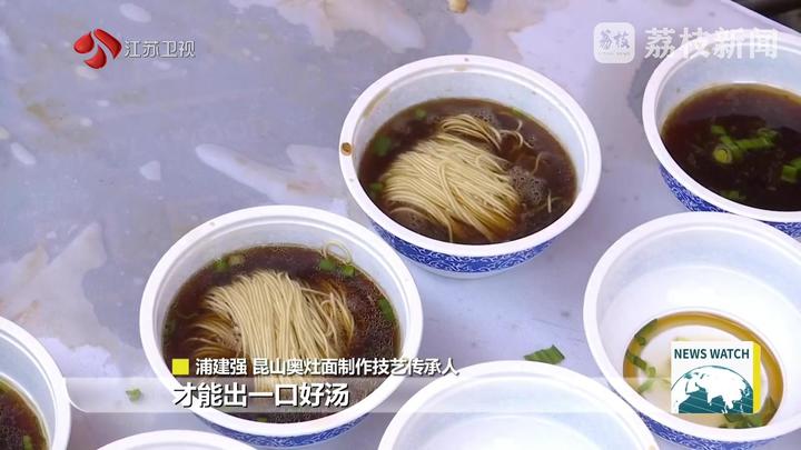 昆山奥灶面制作技艺传承人浦建强说:“听戏听腔、吃面喝汤,所以面汤是比较讲究的,要熬制6个小时左右才能出一口好汤。面条是细的,但是又有嚼劲,这就是奥灶面的特点。”