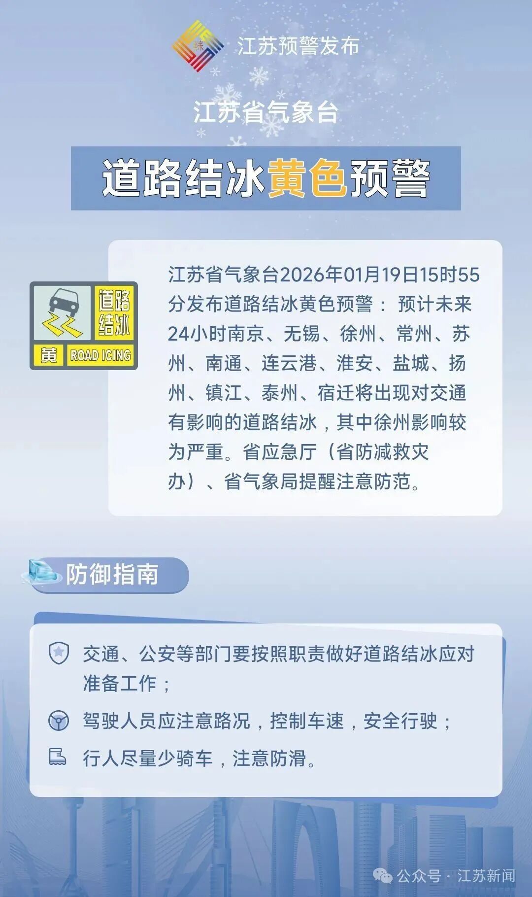 江苏省气象台2026年01月19日15时55分发布道路结冰黄色预警: