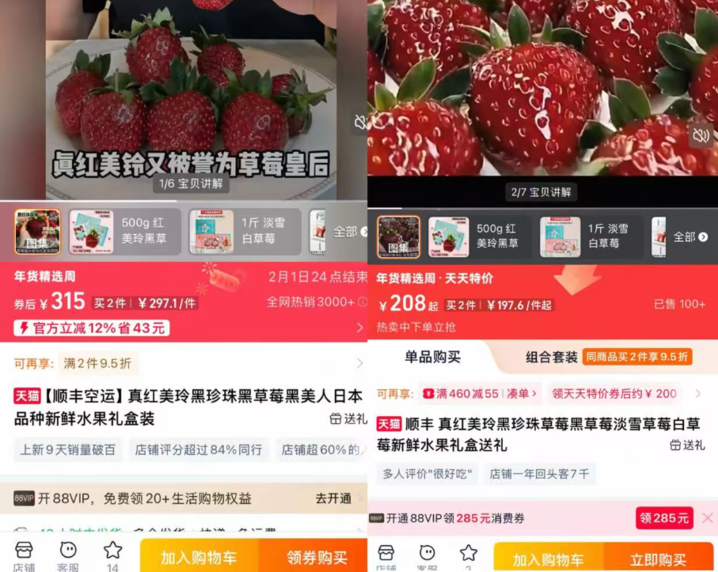 记者查阅淘宝一家店铺的商品信息显示,顺丰空运的500克真红美铃黑草莓甄选大果的券后价格为315元,买2件则单价为297.1元/件;销售记录显示这款草莓全网热销3000+。另一家产自福建的真红美铃黑草莓,同样顺丰空运,500克售价208元,买2件则单价为197.6元/件。