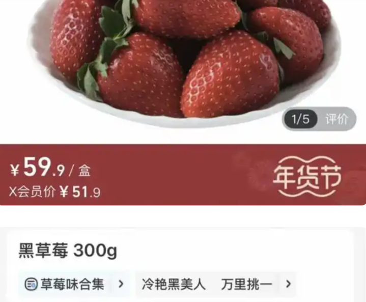 而在盒马,其今年上架的黑珍珠草莓,每300克售价59.9元,X会员价51.9元,低于大部分电商价,但仍是盒马红颜、奶油草莓的两倍,目前月下单人数已超过1万。