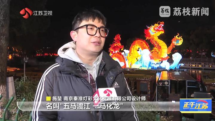 南京秦淮灯彩文化发展有限公司设计师施堃说:“咱们现在身后的灯组名叫‘五马渡江 一马化龙’,堪称白鹭洲公园的灯王。它是以声光电技术复现了神骏渡江、化龙腾起的场景,其间巨龙昂首吐纳运气,龙珠闪转生光,传递吉祥的祝福与城市的奋进活力。”