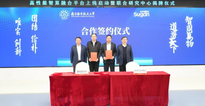 1月20日下午,南京航空航天大学(以下简称“南航”)联合曙光信息产业股份有限公司(以下简称“中科曙光”)、中国联合网络通信有限公司江苏省分公司(以下简称“江苏联通”)共同举办学校高性能智算融合平台上线启动暨联合研究中心揭牌仪式。中科曙光总裁历军、副总裁王海荣,江苏联通党委书记、总经理彭胜军,党委委员、副总经理张国鹏,南航校长姜斌,副校长张启钱出席活动。