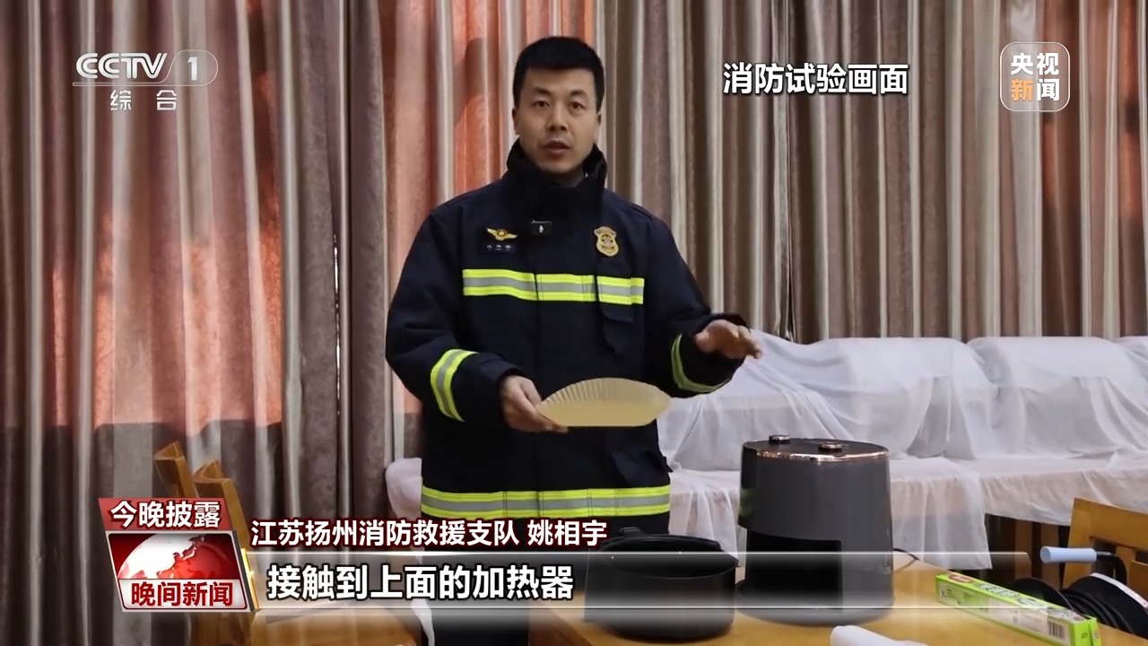 江苏扬州消防救援支队 姚相宇:空气炸锅的托盘垫纸质地都较轻,放置在空气炸锅里,在风扇的风力作用下可能会直接向上飘浮,接触到上面的加热器。