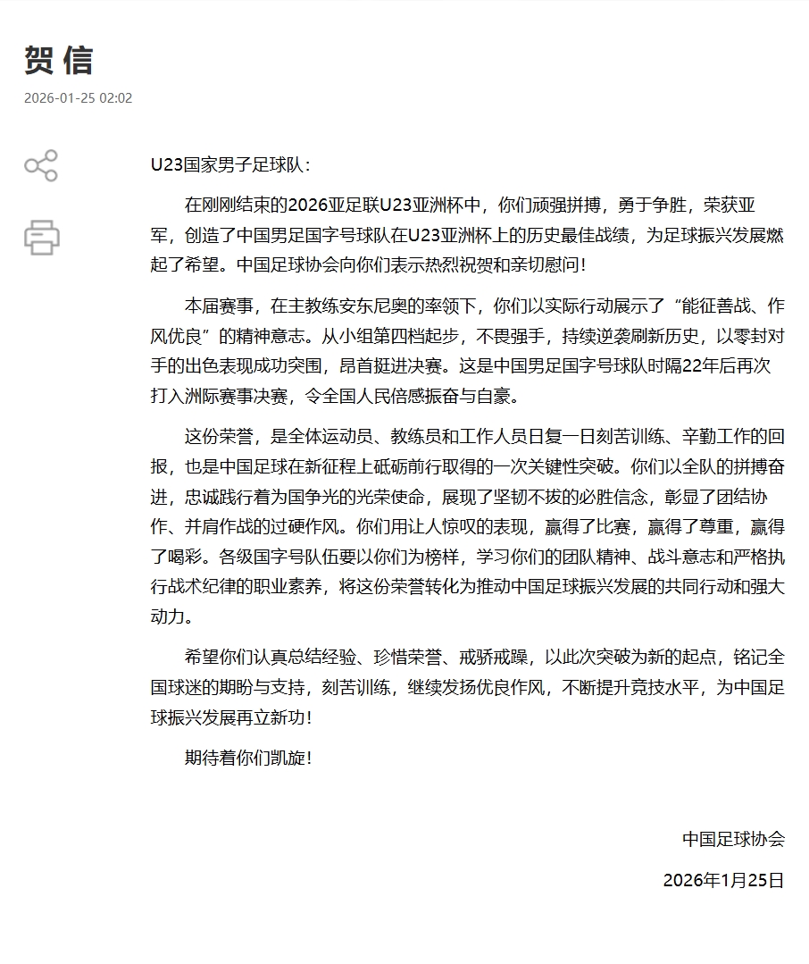 U23国足夺亚军 国家体育总局和中国足协发来贺信 荔枝新闻 2026-01-25 06:48 荔枝新闻讯 U23国足在U23亚洲杯上获得亚军后,国家体育总局和中国足协纷纷向球队发来贺电,祝贺他们取得好成绩,并表示U23国足为中国足球振兴燃起新的希望。