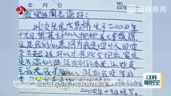扬州大学音乐学院大四学生周和瑶说:“上面写到她是四川人,回家交不起钱,所以没有办法才将我放在那里。也希望我能争气地长大,然后如果可以的话,她也会回来看我。”