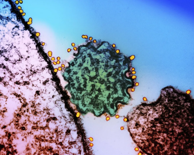 △透射电子显微镜看尼帕病毒。