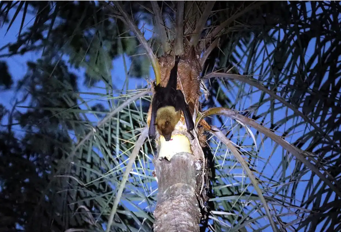 △一只果蝠正在吸食生枣椰汁。
