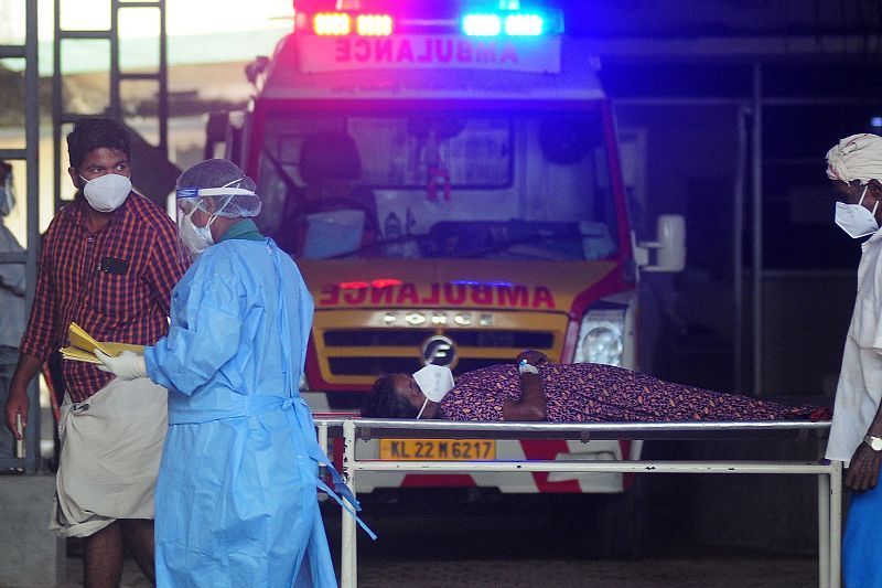 △2023年9月,印度喀拉拉邦一家医院内,医护人员将一名出现尼帕病毒感染症状的病人转移到隔离病房。
