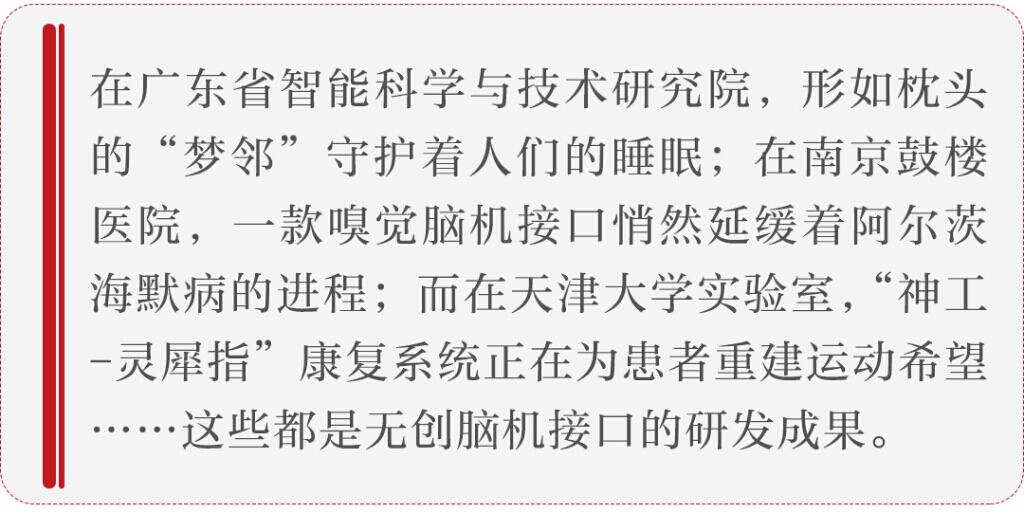 在广东省智能科学与技术研究院,记者看到了外形如枕头一样解决睡眠问题的设备“梦邻”;在南京鼓楼医院,记者看到能延缓阿尔茨海默病发生的嗅觉脑机接口;在天津大学,记者看到“神工-灵犀指”康复系统……这些都是无创脑机接口的研发成果。