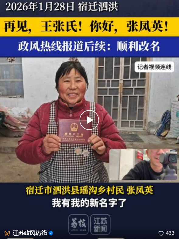 1月28日,江苏广电荔枝新闻中心报道了宿迁市泗洪县村民王张氏想改回自己本来的名字——张凤英,却困难重重。《政风热线》栏目关注此事后,1月29日,当地派出所完成调查走访,王张氏顺利改名为张凤英。