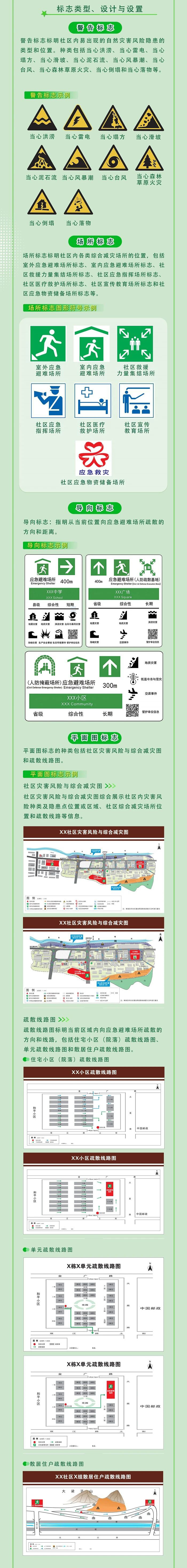 从自然灾害警告标志,到应急场所、疏散导向标识,再到灾害风险图、疏散线路图,兼顾标志的清晰识别、环境融合与紧急场景下的高效指引,可以帮助居民更直观地了解社区灾害风险及减灾资源分布。