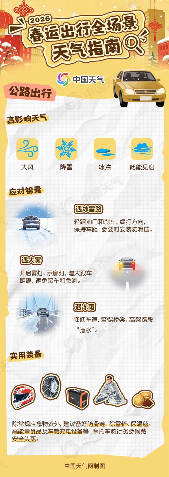 一年一度的春运大幕即将开启,无论你选择公路、铁路、航空、水路哪一种方式归乡或远行,天气都是影响旅途顺畅与安全的重要因素之一。中国天气网梳理四大出行场景天气指南和实用装备,愿这份贴心锦囊能够让你的春运之旅多一份从容与平安。