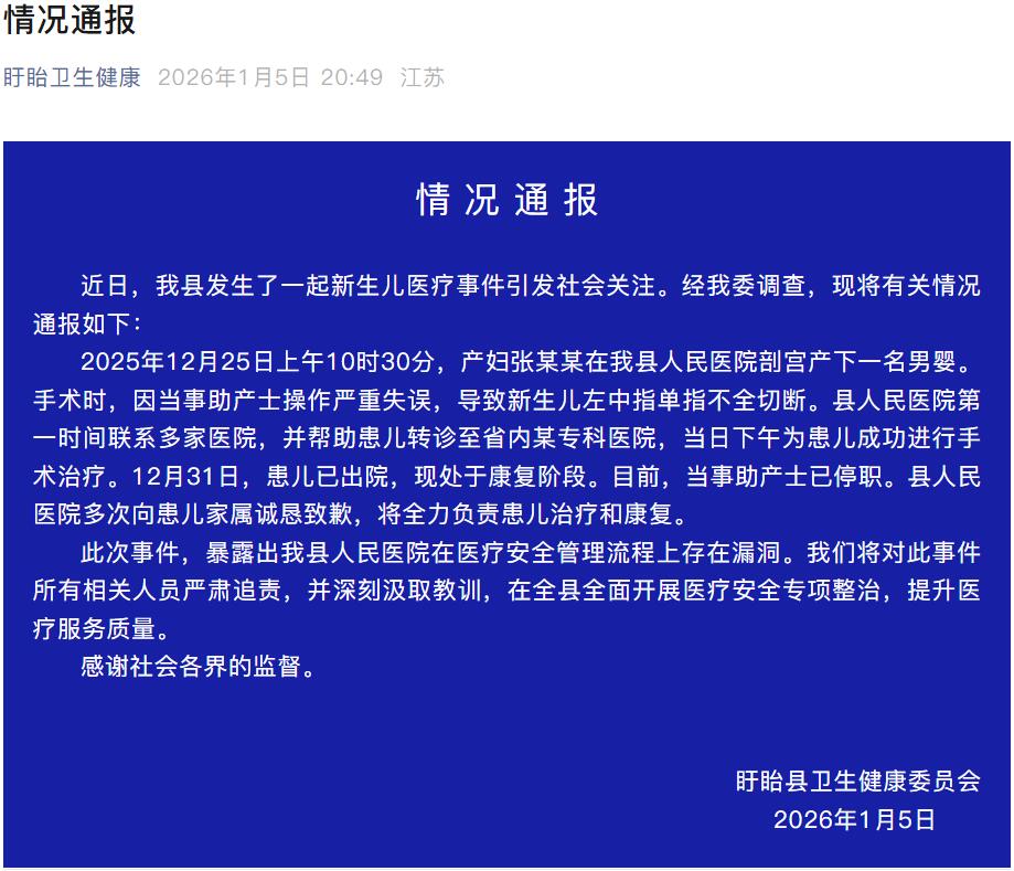 2025年12月25日上午10时30分,产妇张某某在我县人民医院剖宫产下一名男婴。手术时,因当事助产士操作严重失误,导致新生儿左中指单指不全切断。县人民医院第一时间联系多家医院,并帮助患儿转诊至省内某专科医院,当日下午为患儿成功进行手术治疗。12月31日,患儿已出院,现处于康复阶段。目前,当事助产士已停职。县人民医院多次向患儿家属诚恳致歉,将全力负责患儿治疗和康复。