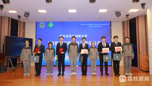 现场,九初向首批受聘的吴健雄学院5位“健雄学子”颁发“健雄领航辅导员”聘书,他们将定期走进九初,开展学业辅导、科创分享等活动;为东南大学吴健雄学院团委书记刘欢欢颁发“健雄领航生涯规划特聘导师”聘书,助力吴健雄班学子获得专业的生涯规划指导。