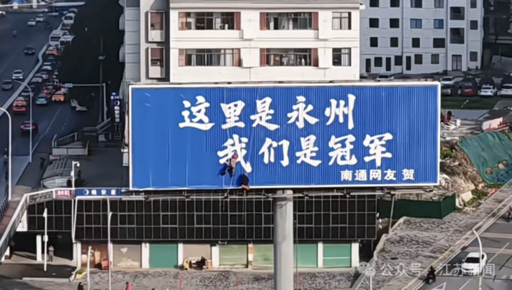 故事的开端,源于苏州网友被永州足球氛围深深打动。湘超夺冠后,一块写着“这里是永州,我们是冠军”的广告牌,悄然亮相永州街头,落款“苏州网友贺”,没想到这直接点燃了热度,江苏“十三太保”中南京、泰州、南通等城市也纷纷跟上。更令人感动的是,江苏电视台记者前往永州进行直播报道时,永州市民与特产店老板闻讯自发前往,送上茶油、脐橙等当地特色产品,直播现场欢声笑语,两地情谊在镜头内外自然流淌。