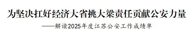 2025年,全省公安机关坚持以习近平新时代中国特色社会主义思想为指导,认真落实习近平总书记关于新时代公安工作的重要论述和对江苏工作的重要讲话重要指示精神,在省委、省政府和公安部的坚强领导下,紧扣“走在前、做示范”的总体定位,全力以赴防风险、保安全、护稳定、促发展,为坚决扛好经济大省挑大梁责任贡献公安力量。江苏公安工作46次获公安部通令嘉奖或贺电表扬,10项创新做法被公安部通报、向全国推广。