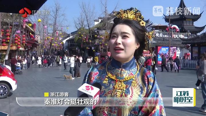 一位浙江游客说:“我是第一次到南京,秦淮灯会挺壮观的,我还拍了好多照片分享给家人。”一位南京市民说:“节前这些灯比较多,我们买了一个粉色的小马花灯,小朋友比较喜欢,这个马还带个翅膀,寓意着一飞冲天。”