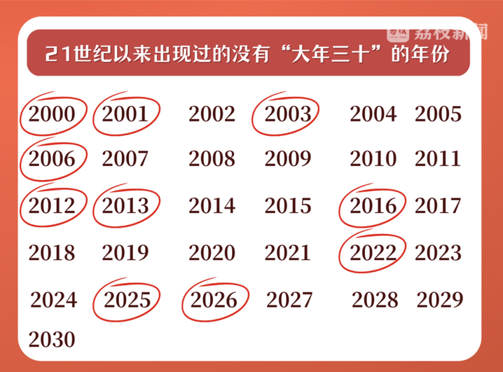 2000年至今,大年三十“消失”过10次:2000、2001、2003、2006、2012、2013、2016、2022、2025、2026。