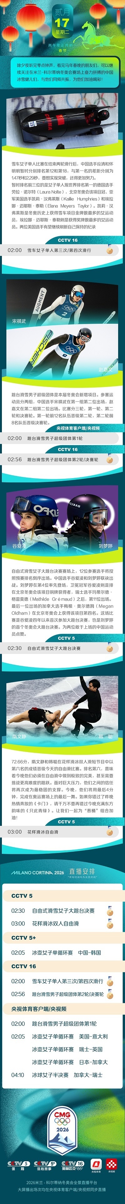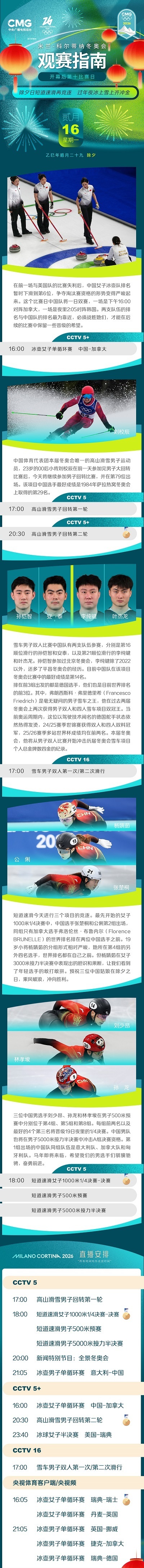 米兰-科尔蒂纳冬奥会开幕后第十比赛日,除夕夜短道速滑再竞逐,过年夜冰上雪上齐冲金。