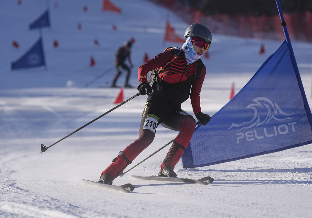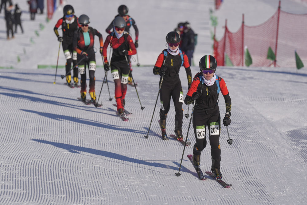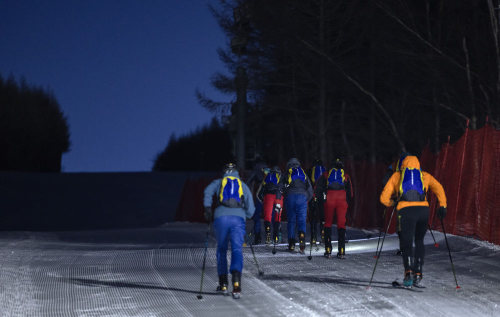 “爬”的阶段,专业术语叫作“上升”,选手需在雪板下粘贴止滑带,或者背着雪板在雪坡上爬升,这是模拟山区居民踩着毛皮雪板攀登雪山,以及遇到崎岖山路时背板徒步登山的过程;而“下滑”环节则与高山滑雪有些类似,模拟了人们下山绕障碍物滑行的过程。