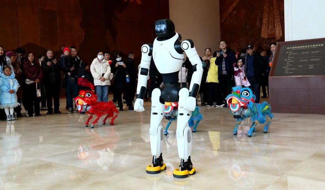 在四川绵阳梓潼两弹城景区,智能机器人与机器狗同时登场,为游客们表演多种技能,引得现场游客拍手叫好。智能机器人为游客表演踢腿、转身、出拳、击打等武术套路和太极拳动作;机器狗身穿醒狮服装,显得十分俏皮可爱。在工作人员的操控下,机器狗熟练地蹲地、起身、前进、侧翻、后空翻,做出很多高难度的舞狮动作,充分展示出景区独特的科技魅力。