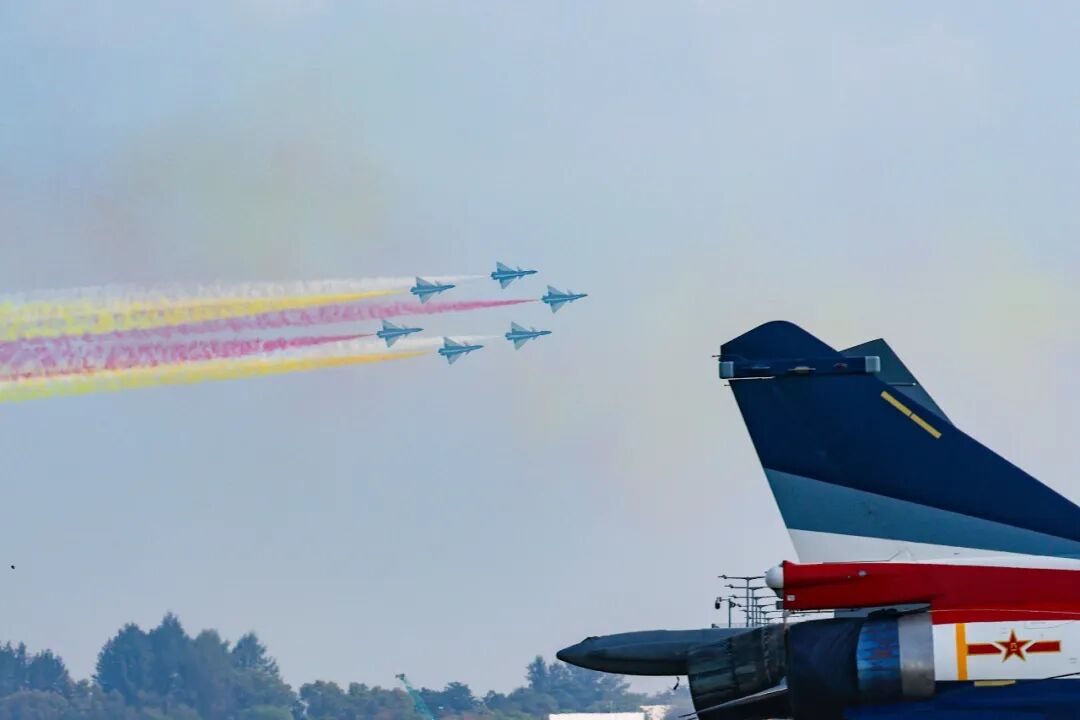 “cleared for takeoff(允许起飞)”,接到塔台起飞指令后,6架歼-10表演机在云底高600米的条件下,分2批快速滑跑起飞,伴随着巨大轰鸣声冲向天际,在空中完成集合编组后,随即飞往机场附近海面上空。