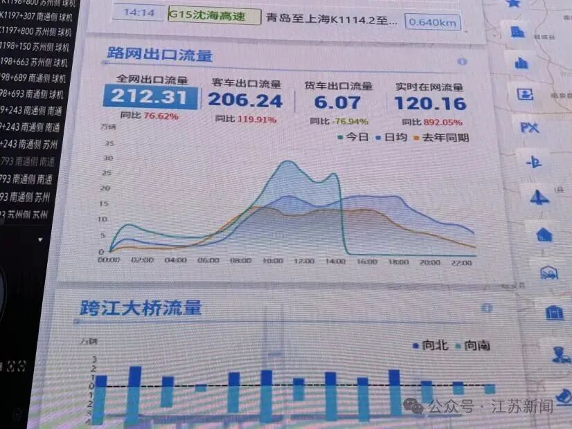 截至2月22日14时,全省高速公路联网出口流量205.17万辆,全省共13条路段和2座跨江大桥出现车多缓行,包括G2京沪高速淮安、宿迁、扬州段,G25长深高速连云港、无锡、淮安段,G15沈海高速连云港、苏州、盐城、南通段,S35阜溧高速泰州段,G1515盐靖高速泰州段,S49新扬高速宿迁、淮安、扬州段由北往南方向;G42沪蓉高速镇江、常州段,G36宁洛高速南京段,G1516盐洛高速淮安段,G30连霍高速徐州段,G4221沪武高速南京、常州段,G2513淮徐高速宿迁段,G3京台高速徐州段由西往东方向;苏通大桥、江阴大桥由北往南方向。