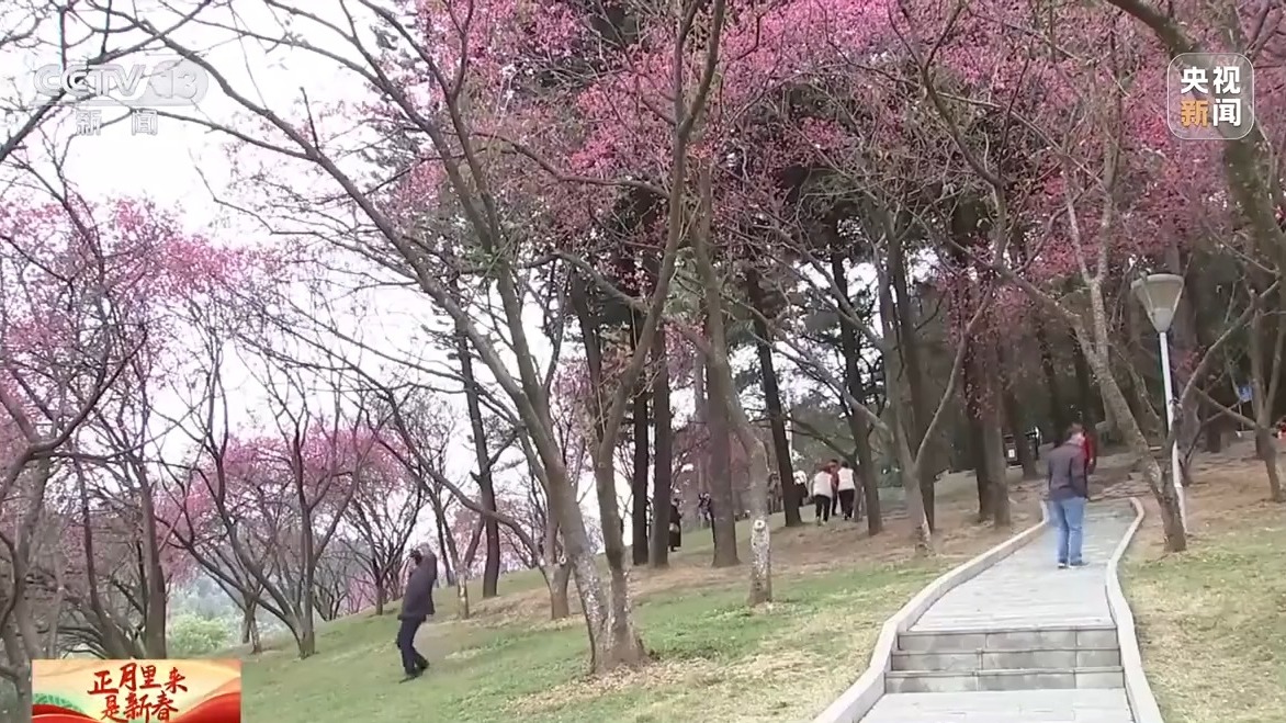 在广西南宁的石门公园樱花谷内,3000余株樱花迎来盛花期,粉色花海与园内红灯笼、中国结等新春装饰相映成趣,吸引大批市民游客前来踏青赏花,游客漫步花海间,驻足拍照留念,在花香中感受别样年味。