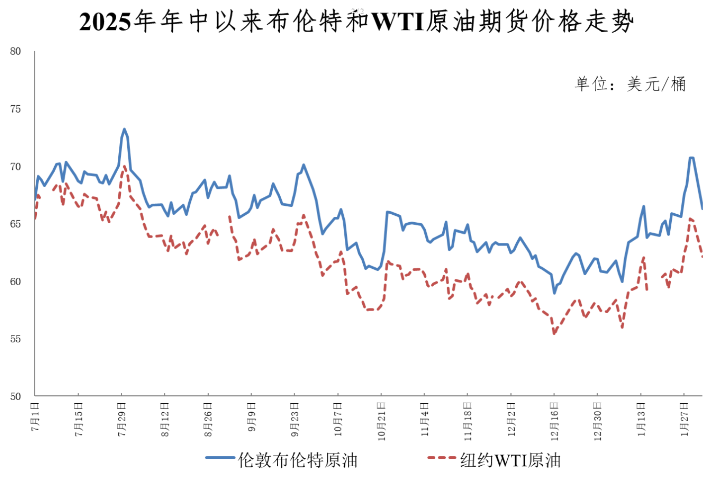 调价周期内,受地缘政治局势变化、美国风暴天气影响生产等因素影响,国际油价先升后降,平均水平较上一轮调价周期上涨。期初,美国加大对伊朗施压力度,宣布向伊朗派遣舰队,并对运输伊朗石油的船只实施更多制裁,地缘风险溢价上升。同时,美国遭遇冬季风暴天气,原油产量与出口受到制约,墨西哥湾沿岸原油出口大幅下降,商业原油库存持续减少。受上述因素推动,布伦特原油期货价格一度突破每桶70美元。期末,随着美伊计划开展谈判,地缘政治紧张情绪短期内得到缓解,国际油价大幅回落。目前布伦特原油期货价格降至每桶66美元左右。