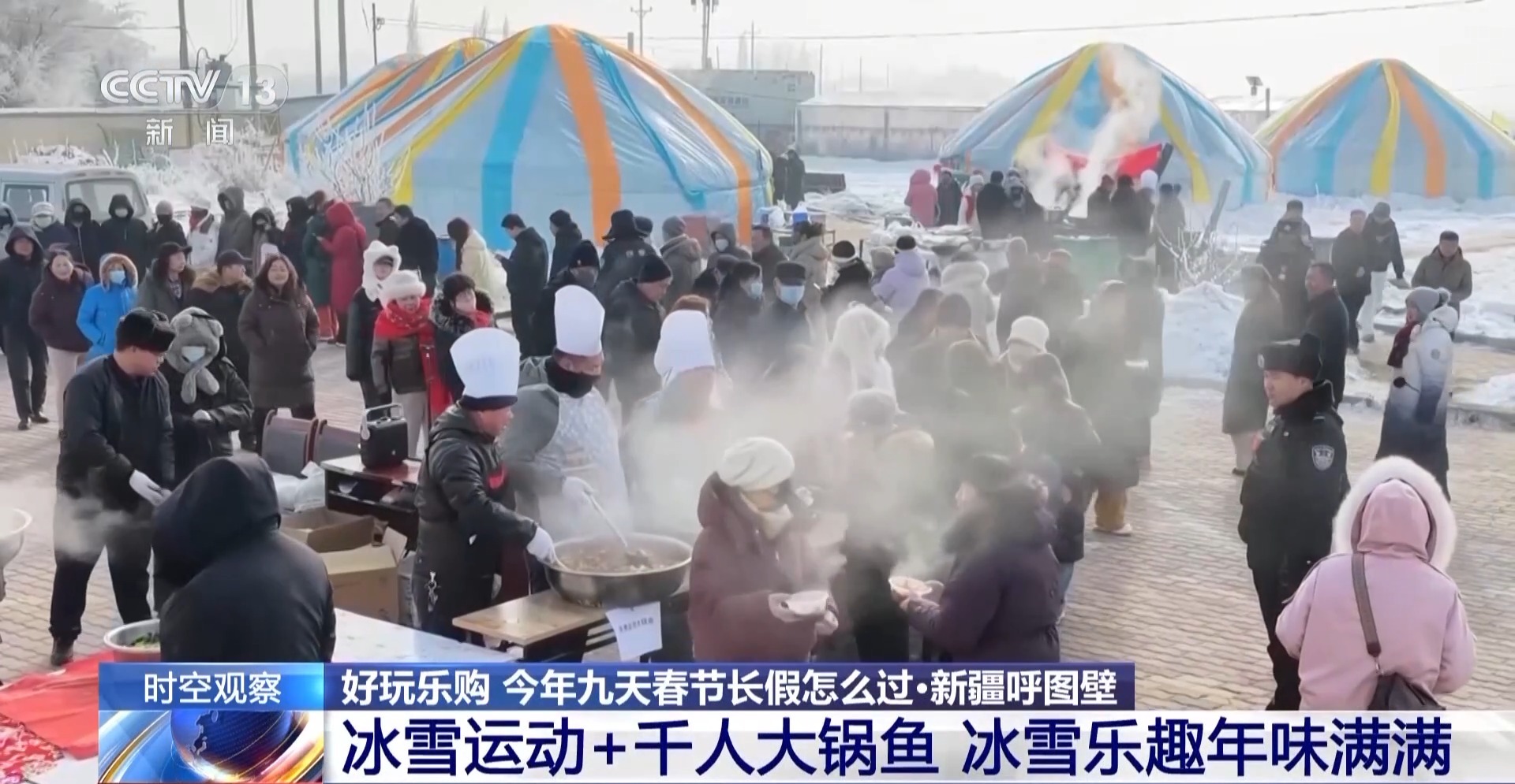 2月1日,在新疆呼图壁县,冰天雪地中的百泉湖热闹非凡,这里不仅有各项冰雪游乐活动,还有现场熬煮的千人大锅鱼可以品尝。这也吸引了不少游客来这里感受年味中的冰雪乐趣。