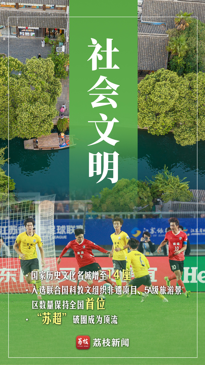 事实就是有力的说明,数据就是客观的印证。“十四五”期间,全国文明城市增至37座,无锡创成全国首个“世界音乐之都”,扬州中国大运河博物馆入选联合国教科文组织非遗项目,5A级旅游景区数量保持全国首位;“苏超”以“足球运动+地域张力+文化共融”的创新模式火爆出圈,赛场内外“礼貌喝彩、人走场净”的文明风尚蔚然成风……一系列亮眼成绩单勾勒出稳步前行的生动图景,系统展示江苏文化建设的丰硕成果与鲜明特色,持续为经济社会发展提供坚强思想保证、强大精神力量、丰润道德滋养。