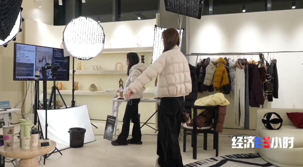 2025年元旦后,这座服装城逐渐由批发转入零售模式,日均客流量数以万计,每天销售额超3亿元。除了线下门店,线上销售也忙着年底冲业绩。羽绒服直播间里,主播们正在推销自家的羽绒服。