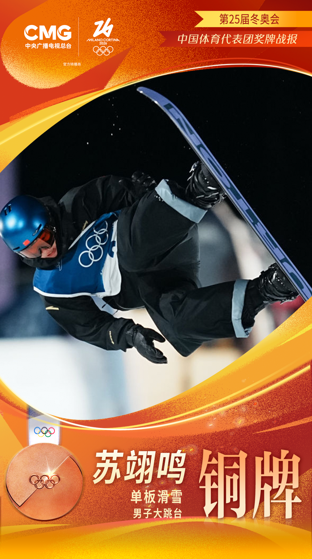 苏翊鸣获得米兰冬奥会中国代表团首枚奖牌