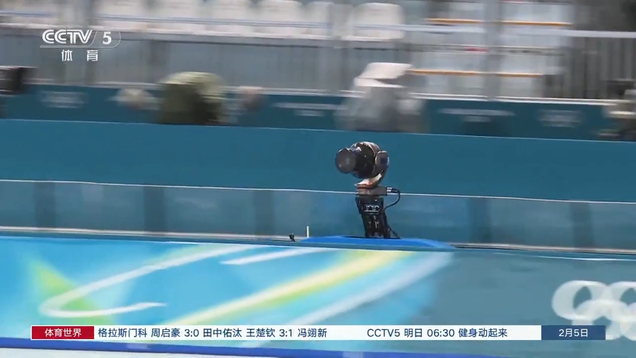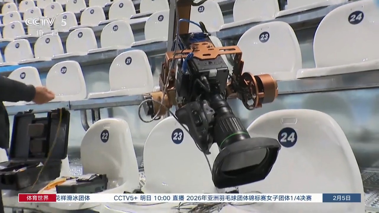 目前,场馆内的各项准备工作已准备就绪,电视转播设备的搭建也已完成,进入最后的调试。在这些设备中,我们见到了一个“老朋友”,那就是在北京冬奥会的速度滑冰转播中曾使用过的“猎豹”。它是由中央广播电视总台自主研发的超高速轨道摄像机系统,能以最高每秒25米的速度追踪运动员的滑行。