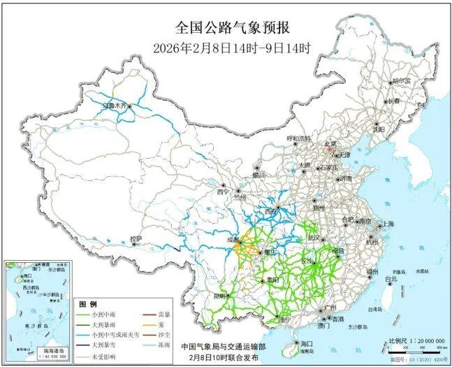 新疆北部、西藏东部、青海南部、甘肃南部、陕西中南部、湖北西部、重庆中北部、四川西部和北部等地部分地区有小雪或雨夹雪,新疆伊犁河谷、西藏东北部等地部分路段有中到大雪,发生道路湿滑、结冰、积雪的风险较高;